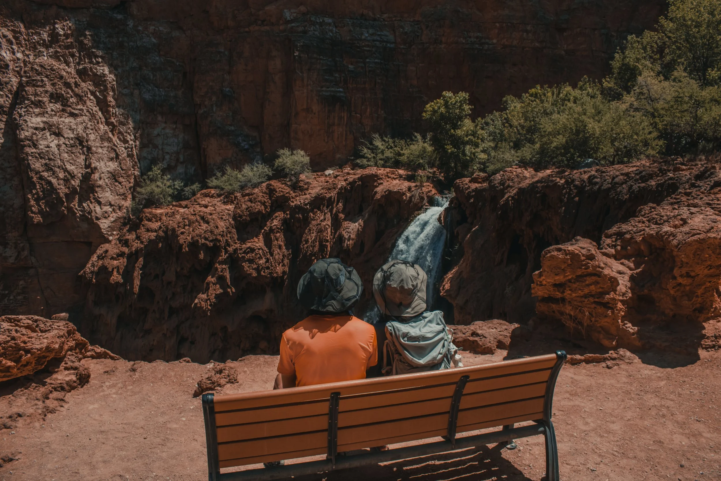 My friends, a couple bound by adventure and quiet moments alike, were sitting on a weathered bench facing the raging turquoise waters of Havasupai Falls. The contrast between the fiery cliffs that surrounded us and the electric blue water crashing below was breathtaking. The cliffs towered above like ancient sentinels, while the water roared with an untamed energy that both humbled and awed me.